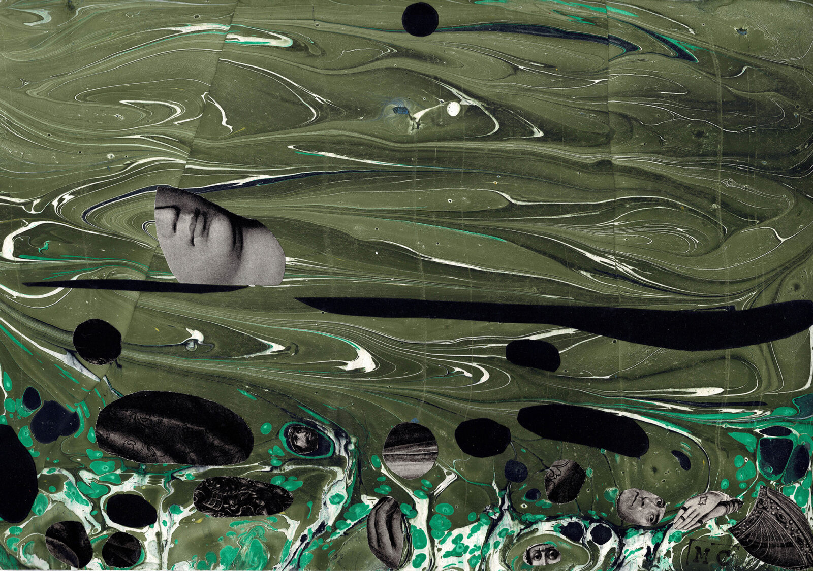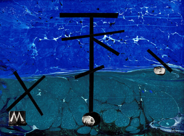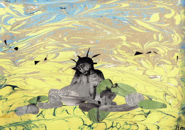 I understand spirituality as the object of a continuous process of becoming, so also the forms of experiencing it have a lot to do with the creative process for me. In the presented series of collages, in addition to fragments of reproductions, I use colorful landscapes created in the ebru painting technique as a form of encounter with the Arabic cultural circle.