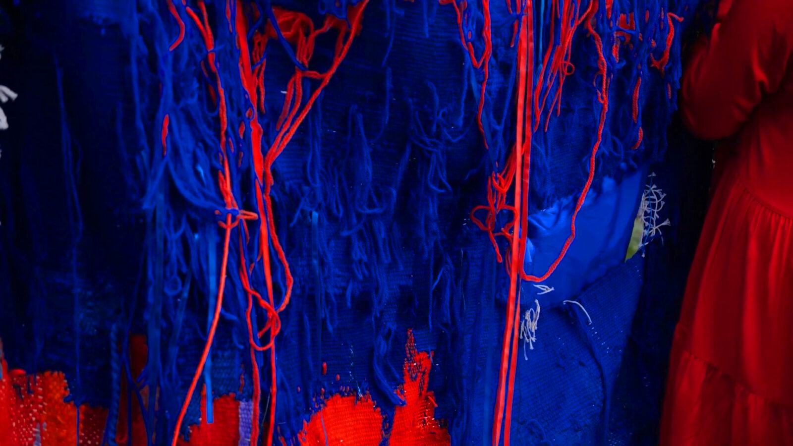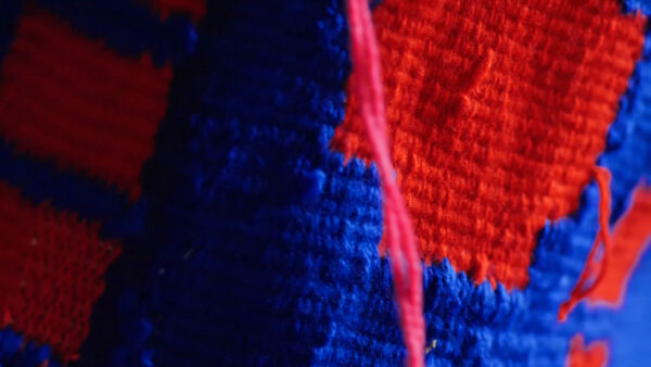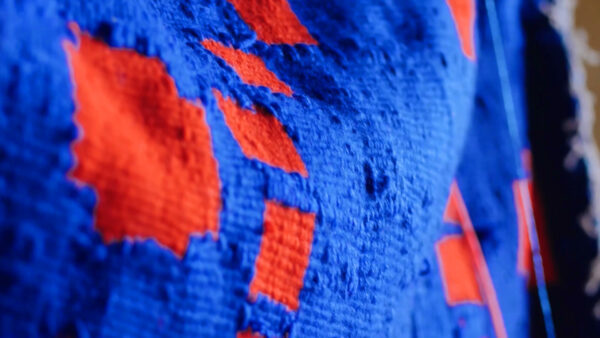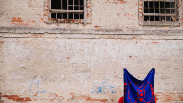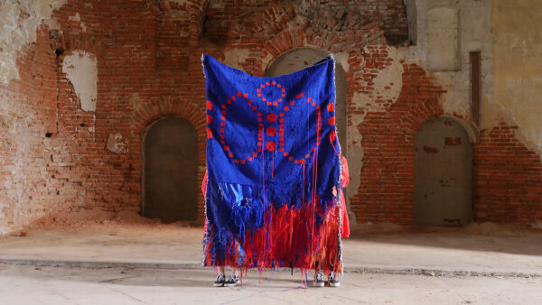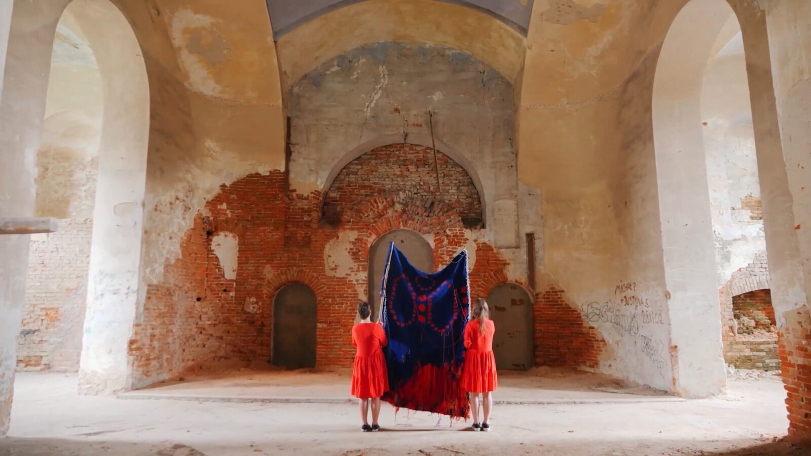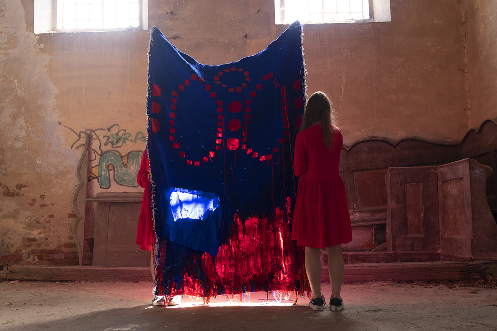 Tkanina jako medium łączy się bardzo mocno z pracą i codziennością kobiet. Transfer znaczeń z architektonicznej polichromii na miękkie medium wynika z mojej decyzji opowiedzenia tych historii poprzez cielesny aspekt tkanej materii. Praca zaistniała jako flaga w jednej z popadających w ruinę cerkwi, powracając w ten sposób do tej przestrzeni i przywracając choć na moment widoczność historii wieloetnicznego pogranicza. Zdarzenie to zostało zapisane w formie wideo.