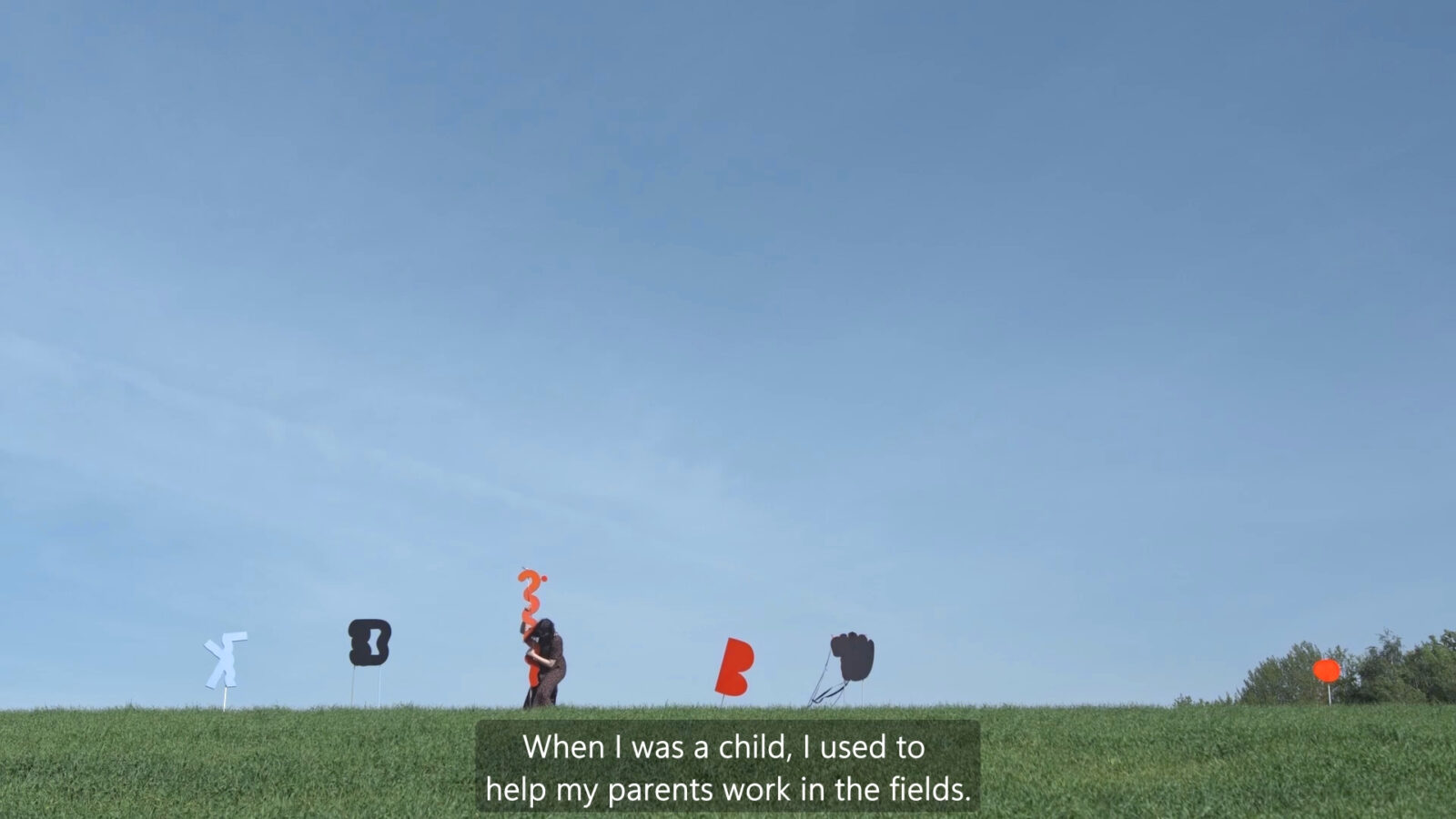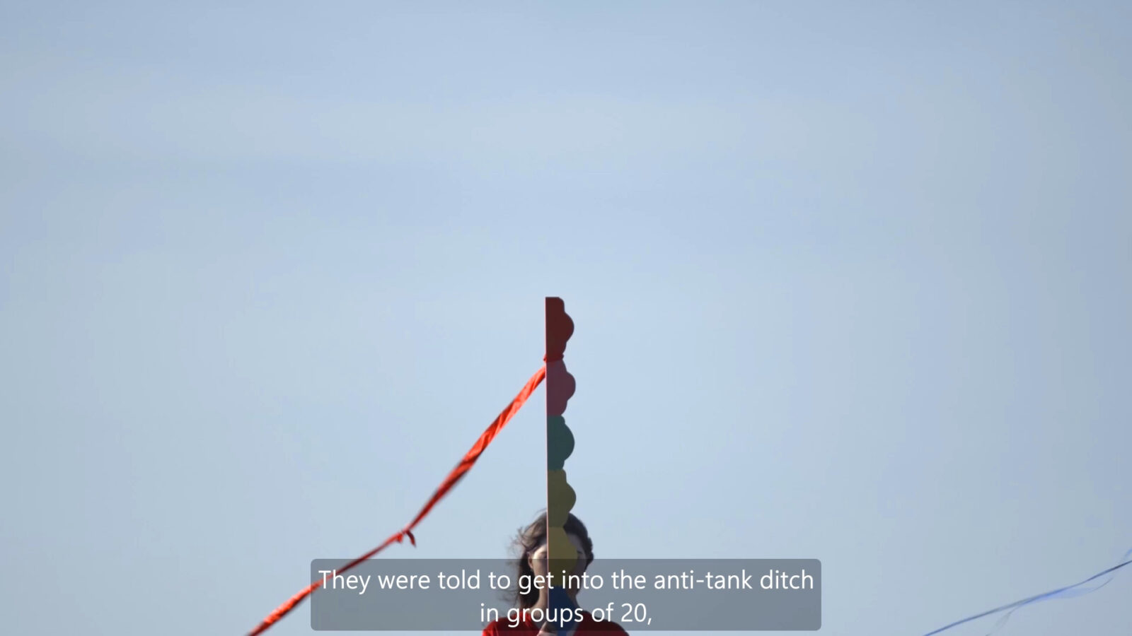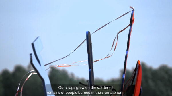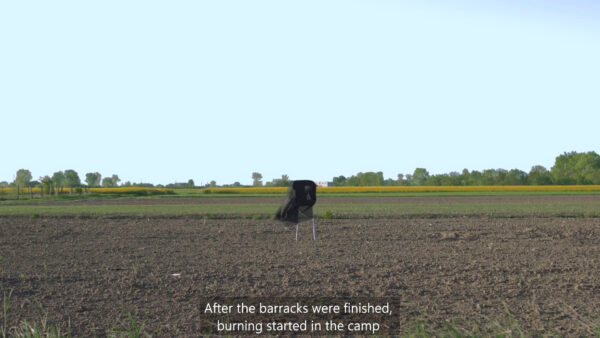 Narrację towarzyszącą pracy wideo stworzyłam na bazie zeznań świadków— budowniczych obozowych baraków, miejscowej ludności, w tym mojej babci, pradziadka i ich sąsiadów. Relacje przenikają się, przez co zyskują charakter wielogłosu.
