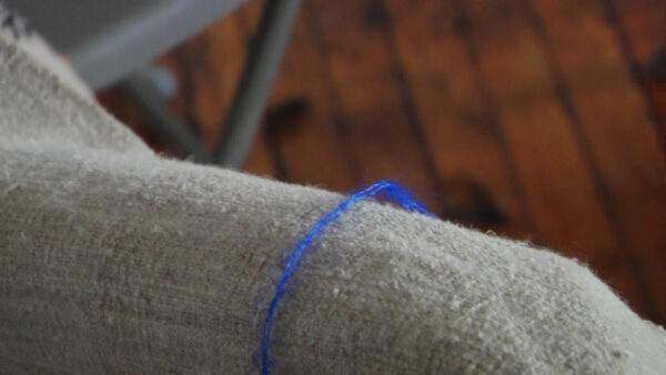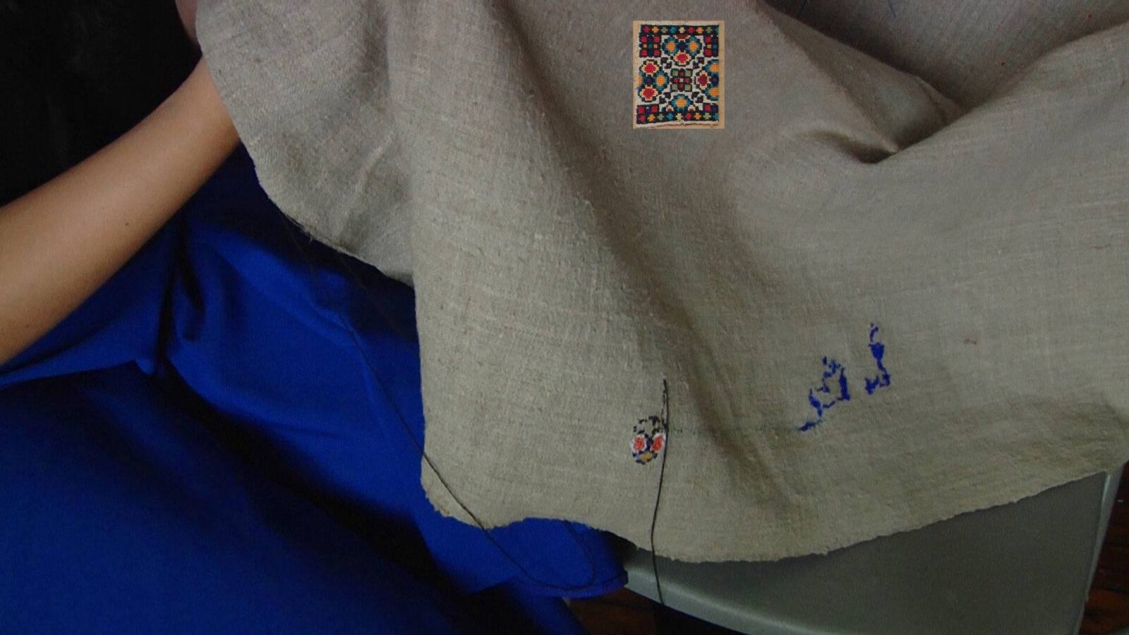 Płótno lniane, które pokrywam haftem to autentyczna, prawie stuletnia tkanina. Wszystkie etapy jego tworzenia, zaczynając od zasiewu lnu, zbioru, przędzenia i tkania zostały wykonane ręcznie. Wyszywanie dokumentuję w postaci wideo, a proces ten jest łącznikiem między mikrohistoriami pogranicza oraz ich wymiarem współczesnym.