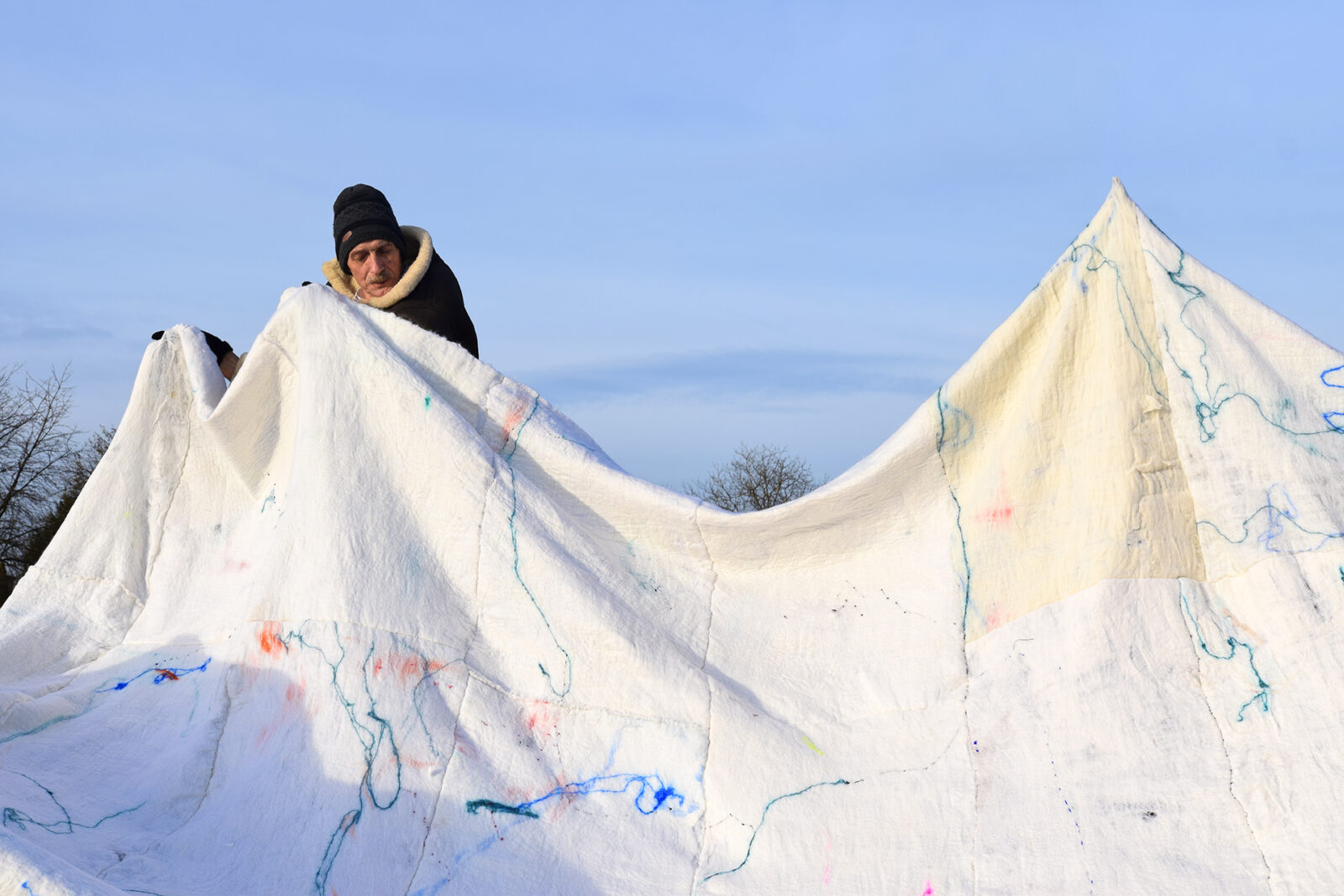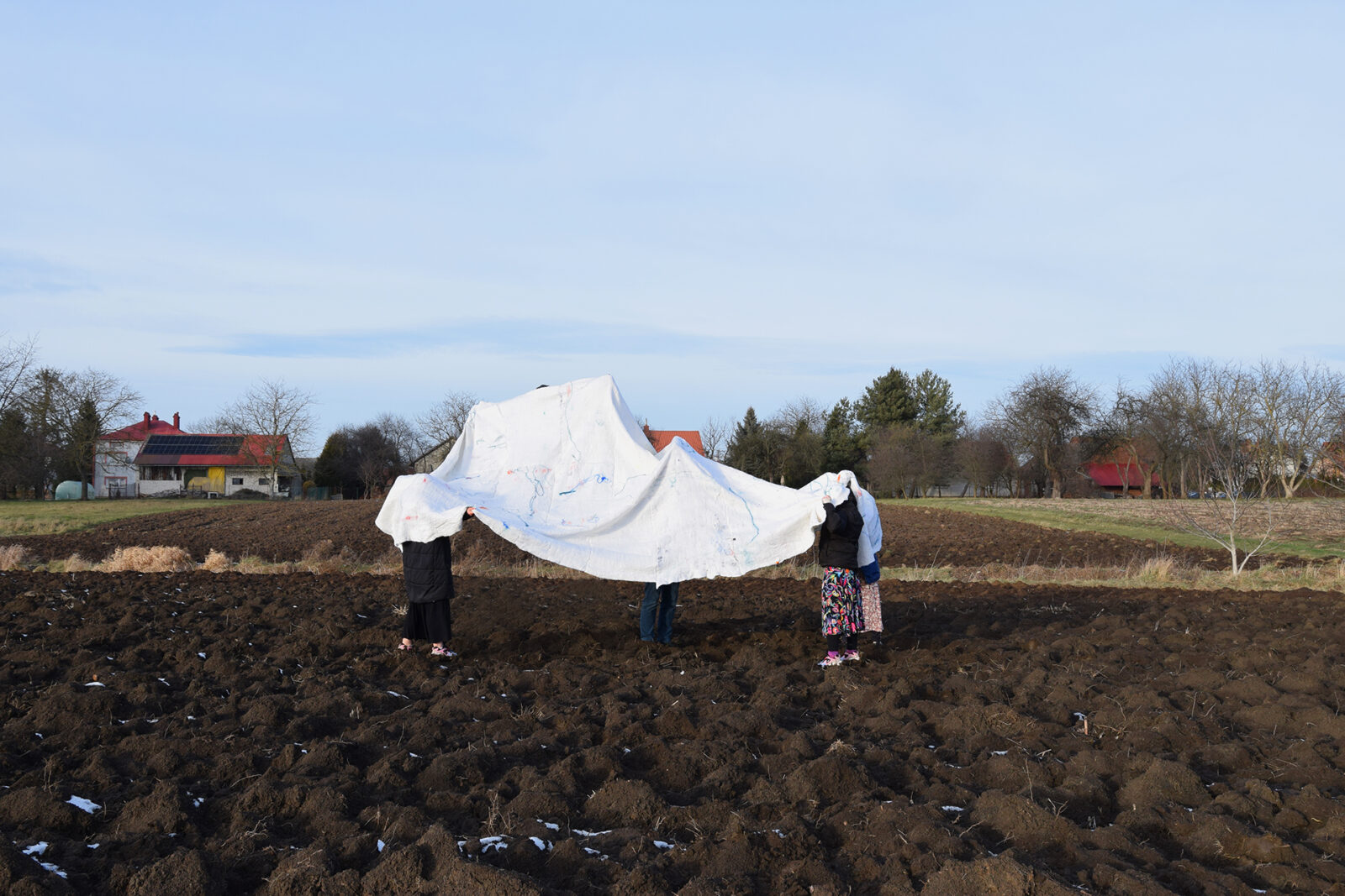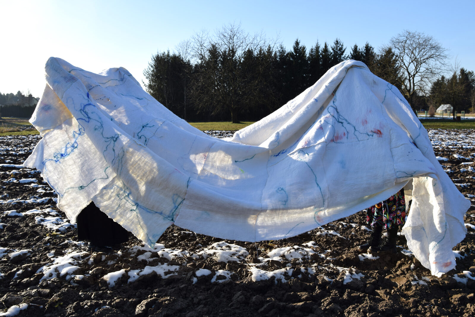 Fotografie przedstawiają pracę nad filcem, w której towarzyszyły mi bliskie kobiety. Prezentują one powstały z fragmentów filcu patchwork na tle zaśnieżonych pól. Częścią pracy jest „Herstoria na wiele głosów” – kolaż rozmów, fragmentów opowiadanych historii, dla których odbioru filcowa tkanka tworzy intymną przestrzeń. Tworzenie tkaniny w obecności innych kobiet było dla mnie sposobem ukazania mojej relacji z nimi i okazją do opowiadania herstorii, które we fragmentach wybrzmiały w instalacji dźwiękowej.