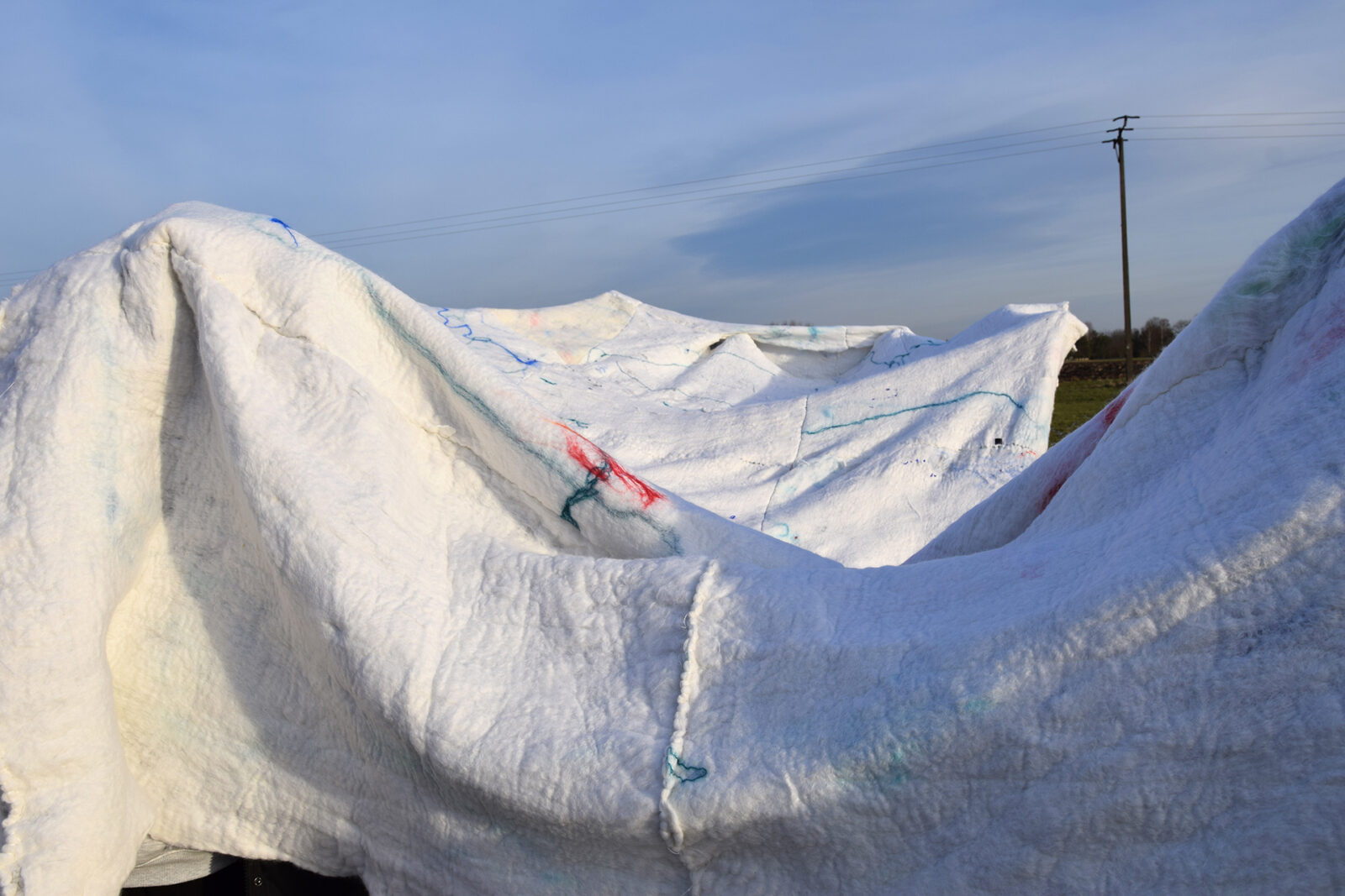 Mapa jest welonem – symbolem, który wprost odsyła do doświadczeń kobiet i herstorii. Stworzenie własnego welonu było dla mnie aktem emancypacji, wynikającym z potrzeby odwrócenia jego wyłącznie ślubnej symboliki i uniezależnienia go od męskiej obecności. Powstała w wyniku filcowania wełny materia to zarówno transparentny, lekki woal, jak i fałdy przypominające tkankę tłuszczową lub zręby śniegu. Tkanina jest dla mnie ciałem, które istnieje pomiędzy tymi odniesieniami.